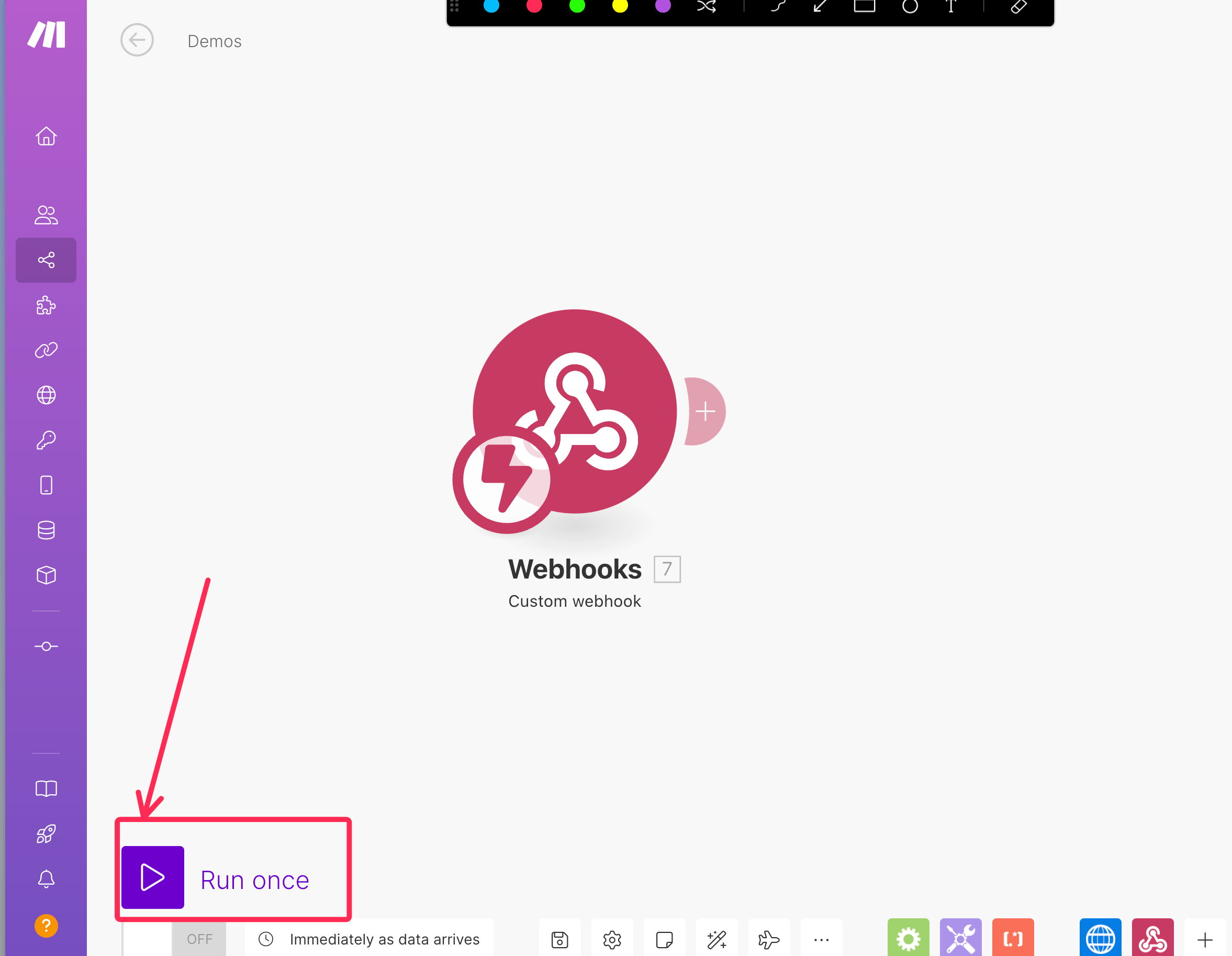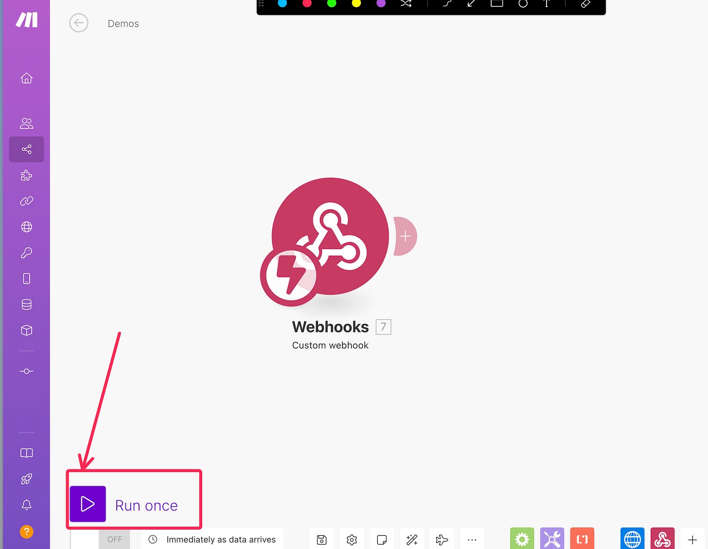 Volte para o Make.com e clique em “Run once”. Quando você faz isso, pode enviar uma requisição API de teste.