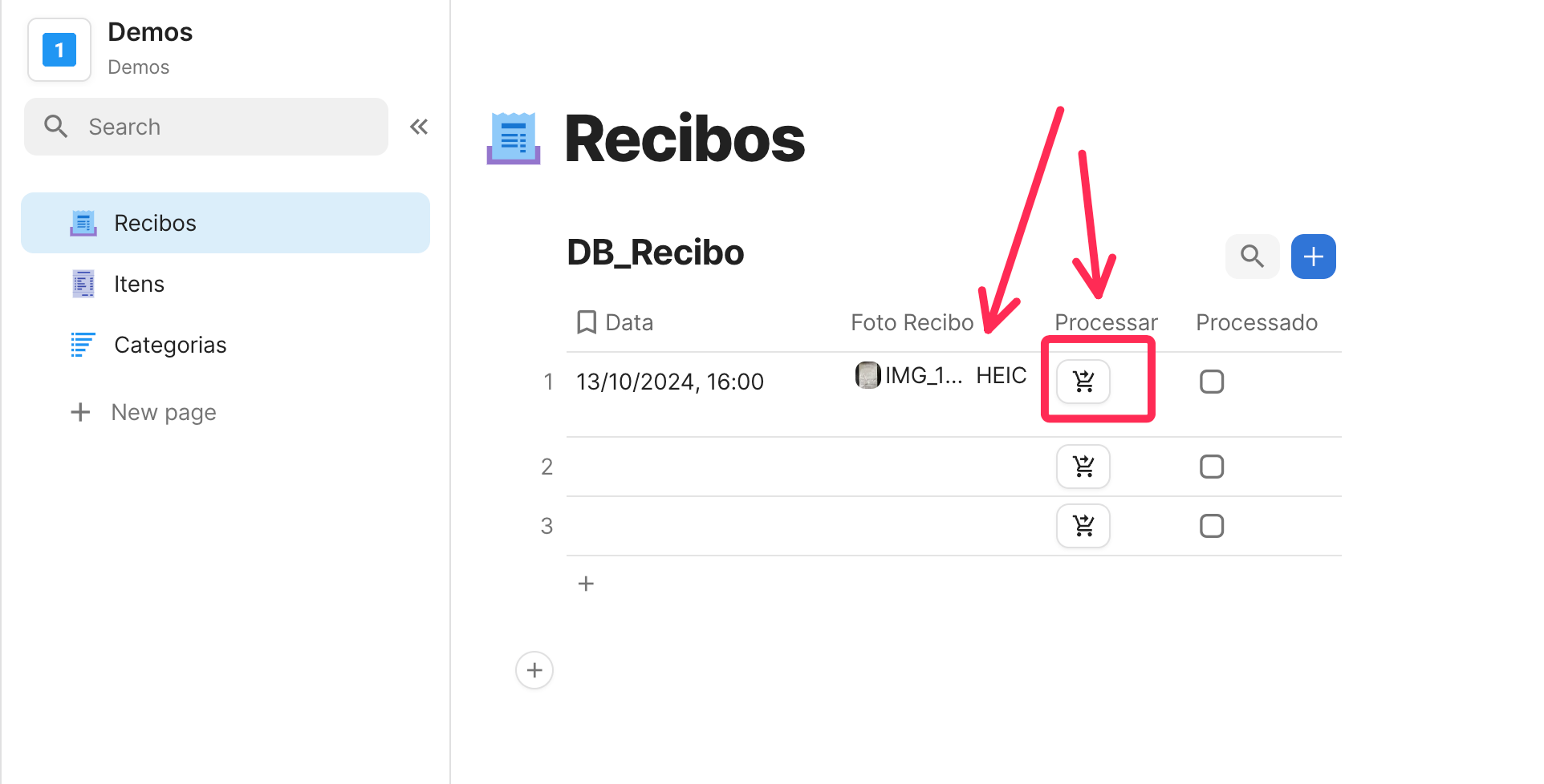 Depois que clicou, volte para a tabela “Recibos”, e tenha certeza que inseriu uma imagem na coluna “Foto Recibo”. Depois clique no botão “Processar”.