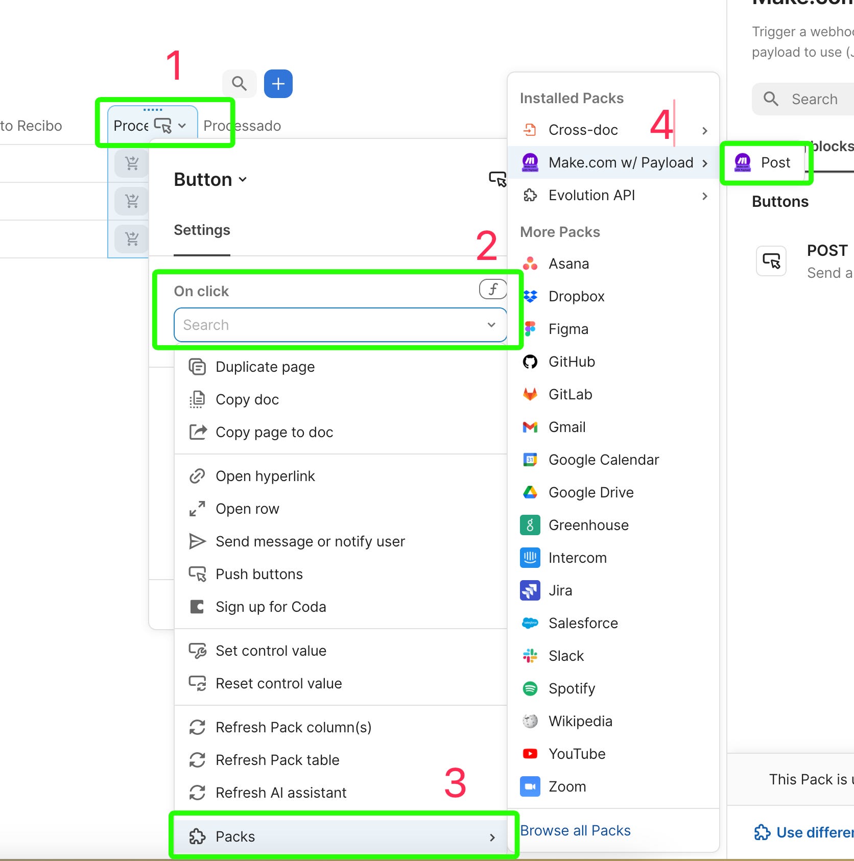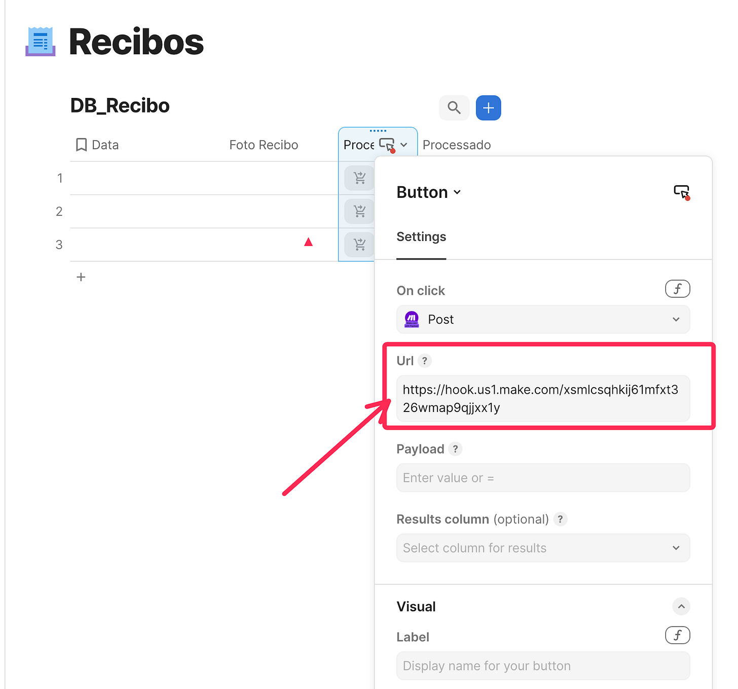 Depois que você inseriu, vá na tabela DB_Recibo, clique com o botão direito na coluna “Processar”, vá em “On click”, selecione “Packs”, depois “Make.com w/ payload” e “Post”