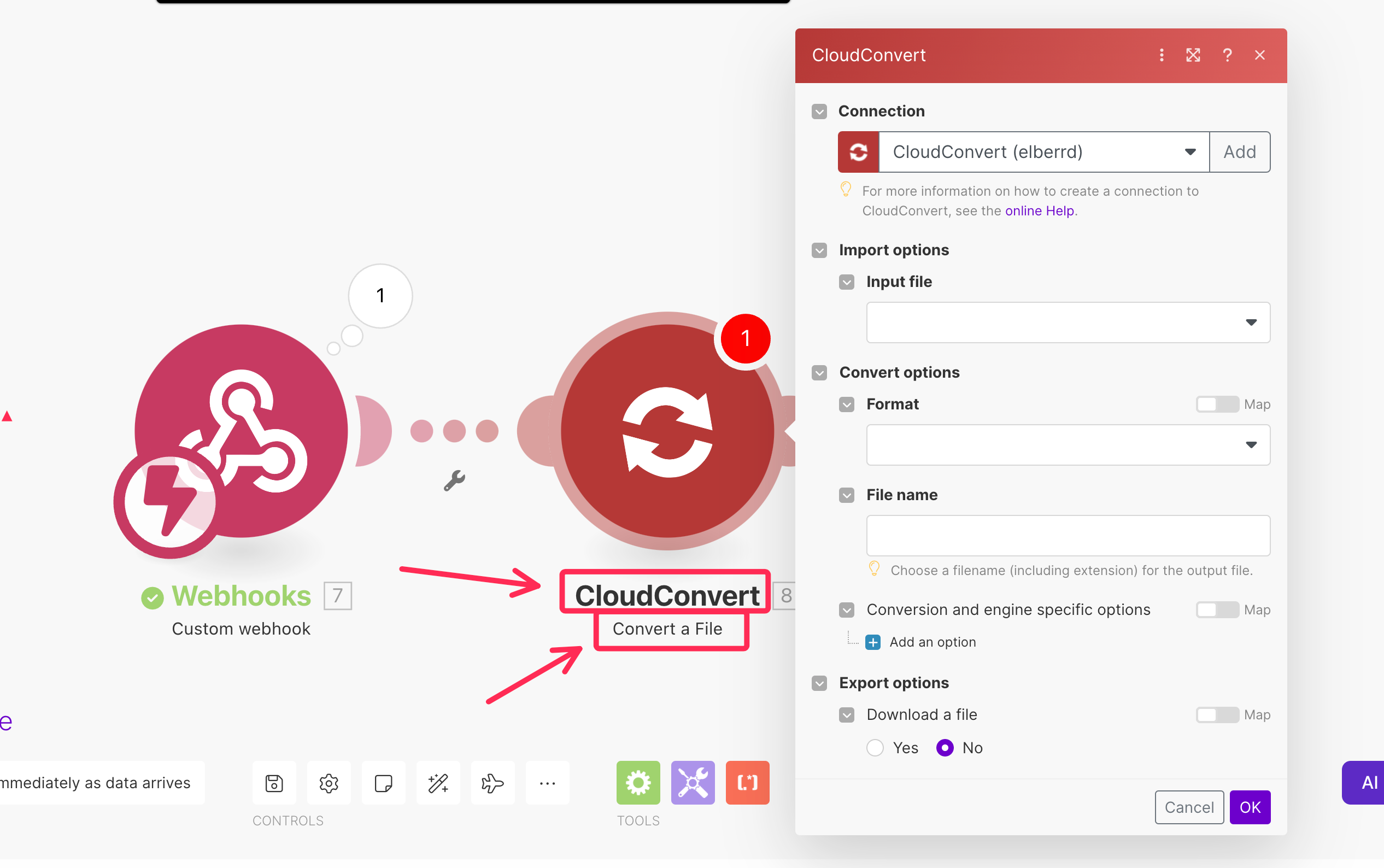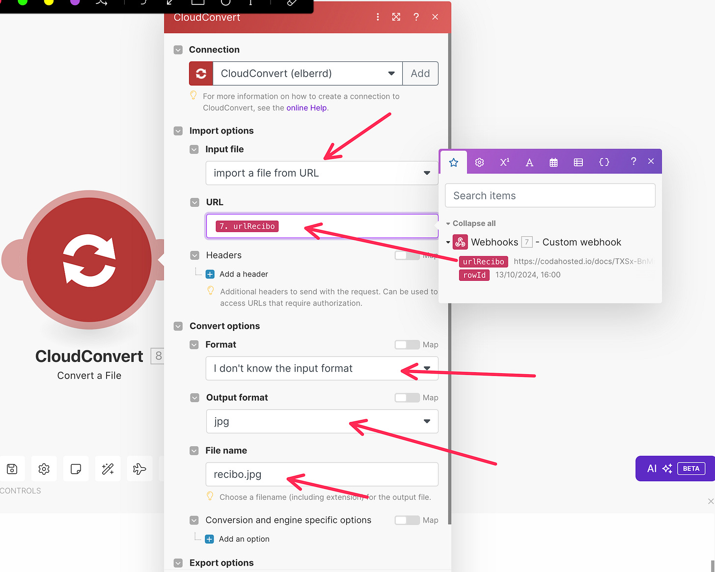 O GPT 4o não aceita muitos formatos de imagens, e as vezes celulares tiram fotos em formatos diferentes, como HEIC. Portanto, precisamos rodar um módulo no Make.com para garantir que as imagens sejam sempre em JPG. Para isso, vamos usar o módulo “Convert a File” do “CloudConvert” - veja a imagem: