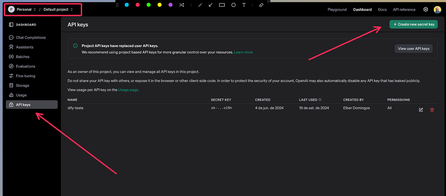 Agora você vai precisar pegar uma API Key da OpenAI para rodar o próximo módulo. Ente em platform.openai.com e siga as instruções da imagem abaixo: