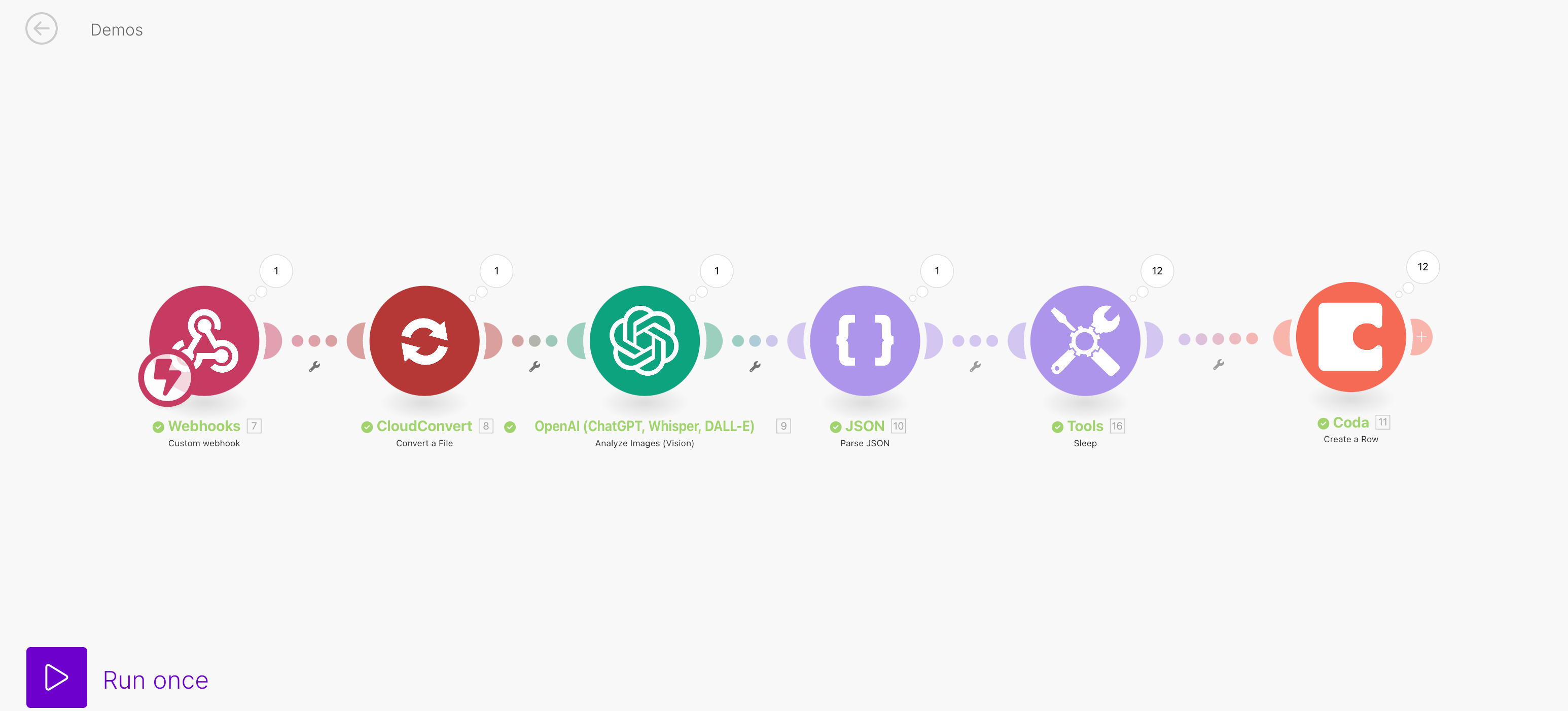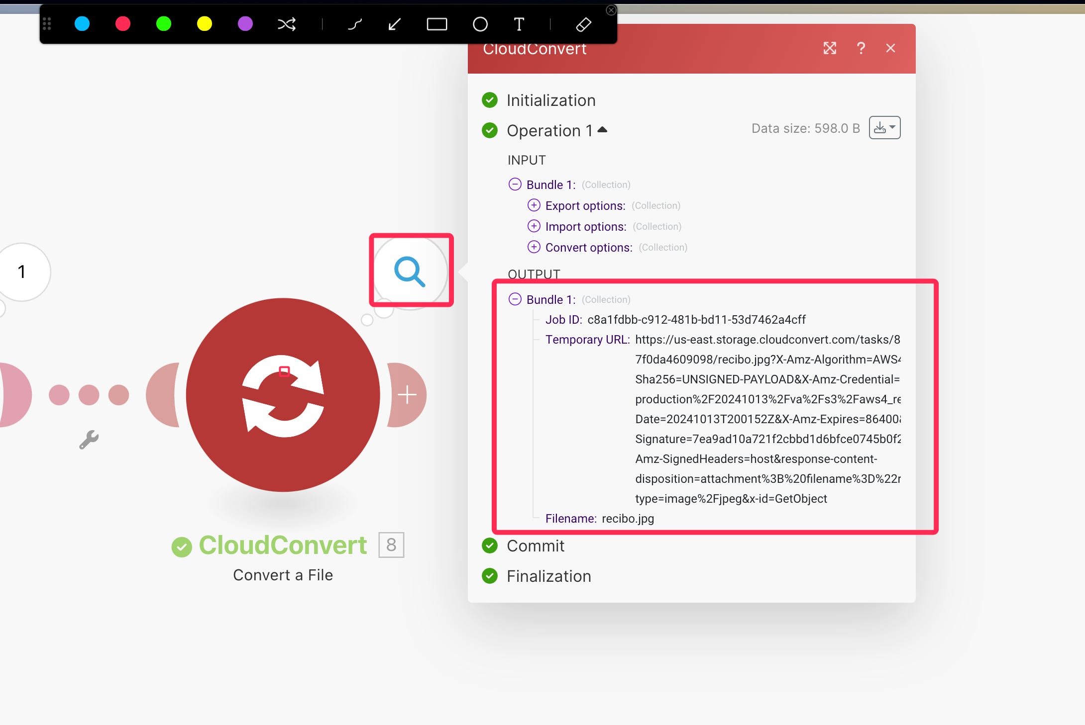 Depois que você finalizou, rode clique em “Run once” novamente, e clique no botão da tabela do recibos para enviar novamente. Ele pode demorar um pouco a depender do tamanho do arquivo, mas quando finalizar, ele vai te revolver um link temporário para fazer o download do arquivo JPG. Este link nós usaremos no próximo passo.