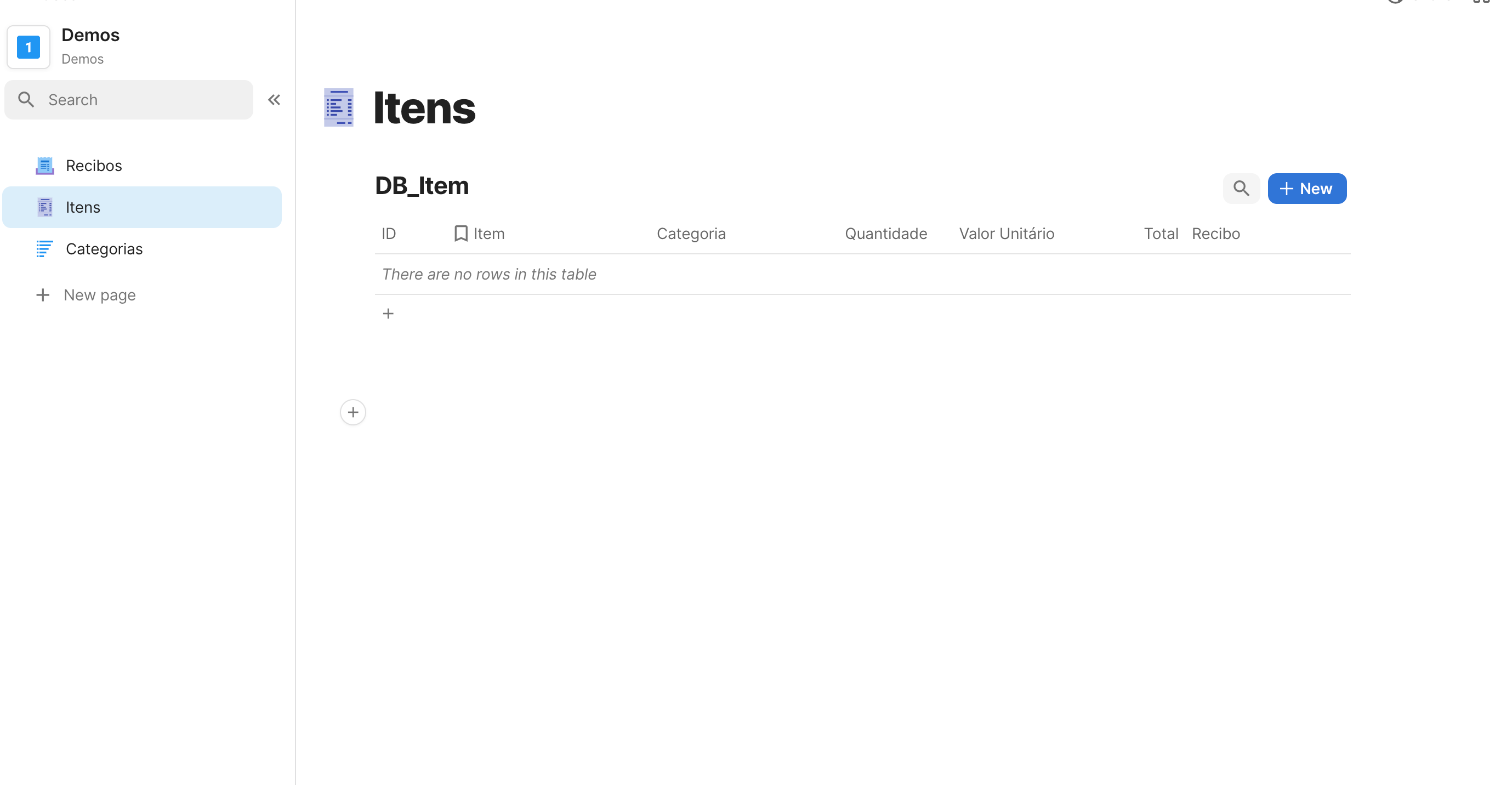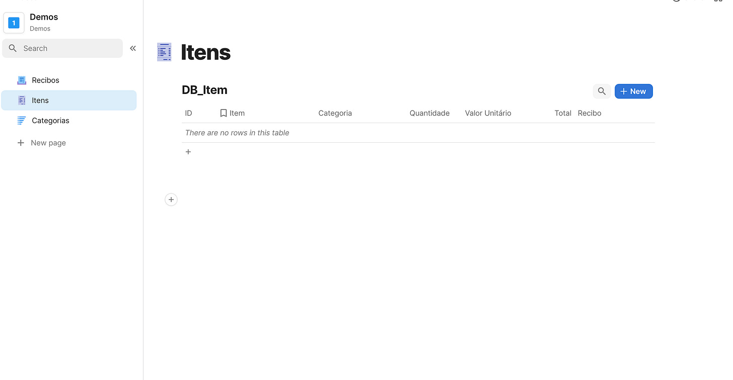 Comece criando um DOC no Coda, e três páginas. Uma para ter o banco de dados do Recibo e outra para o de Categorias e outra para Itens. Eu costumo separar banco de dados em páginas diferentes para não confundir na hora de dar suporte - é uma boa prática.