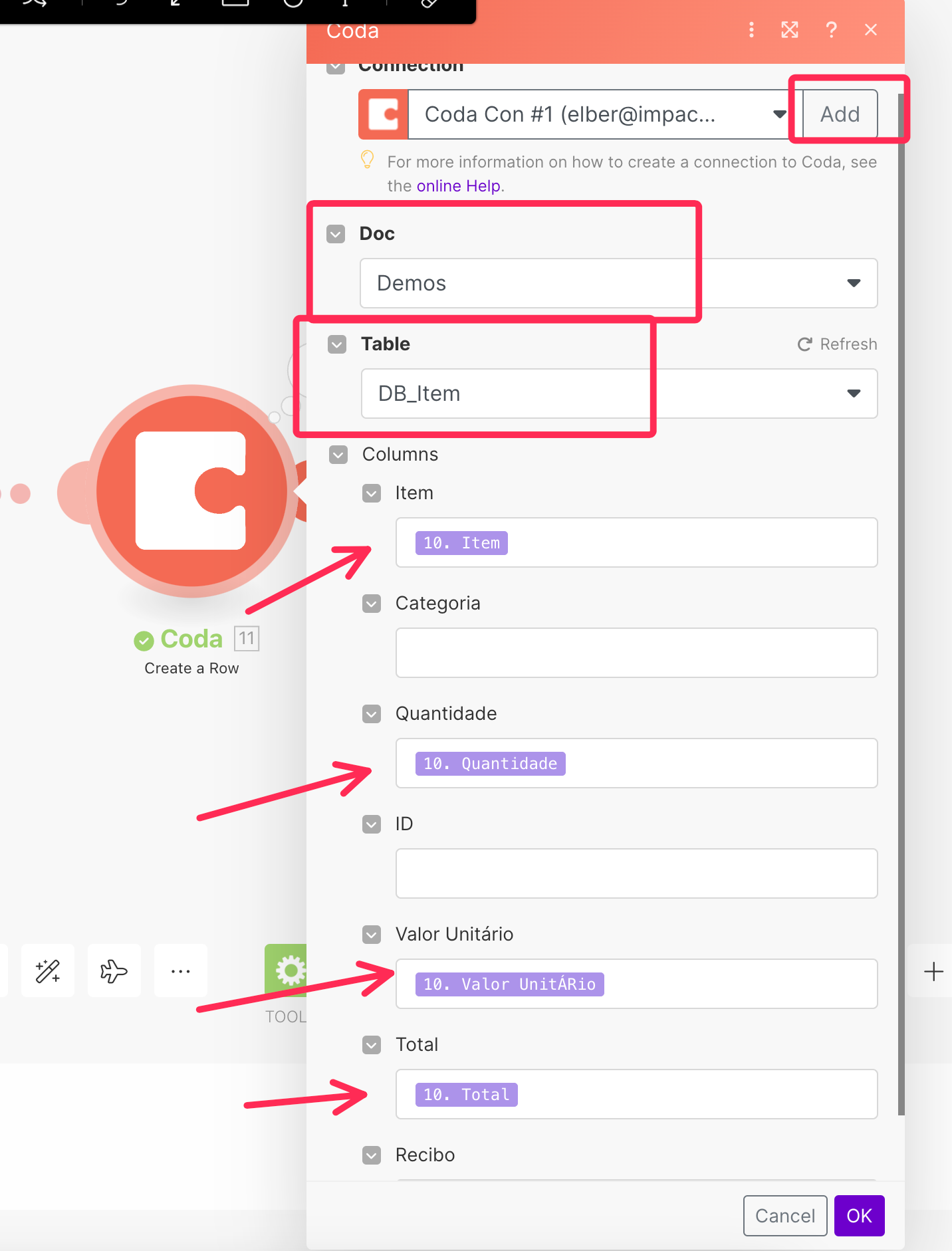 Por fim, adicione o módulo “Create a Row” no Coda, preenchendo os campos com as informações do módulo JSON Parse.