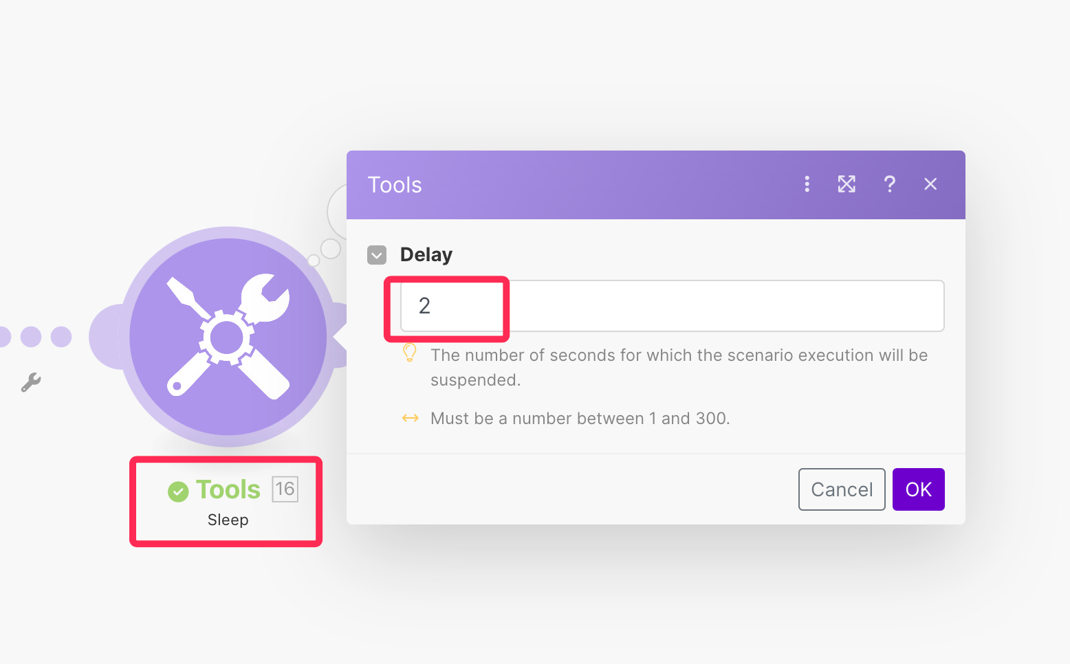Adicione um módulo “Sleep” e coloque 2 segundos. Isso é importante porque o Coda tem limite de chamadas de API. A gente poderia enviar tudo de uma vez, mas nesta demonstração quero fazer assim. Fica o desafio para você enviar tudo de uma vez no Coda.