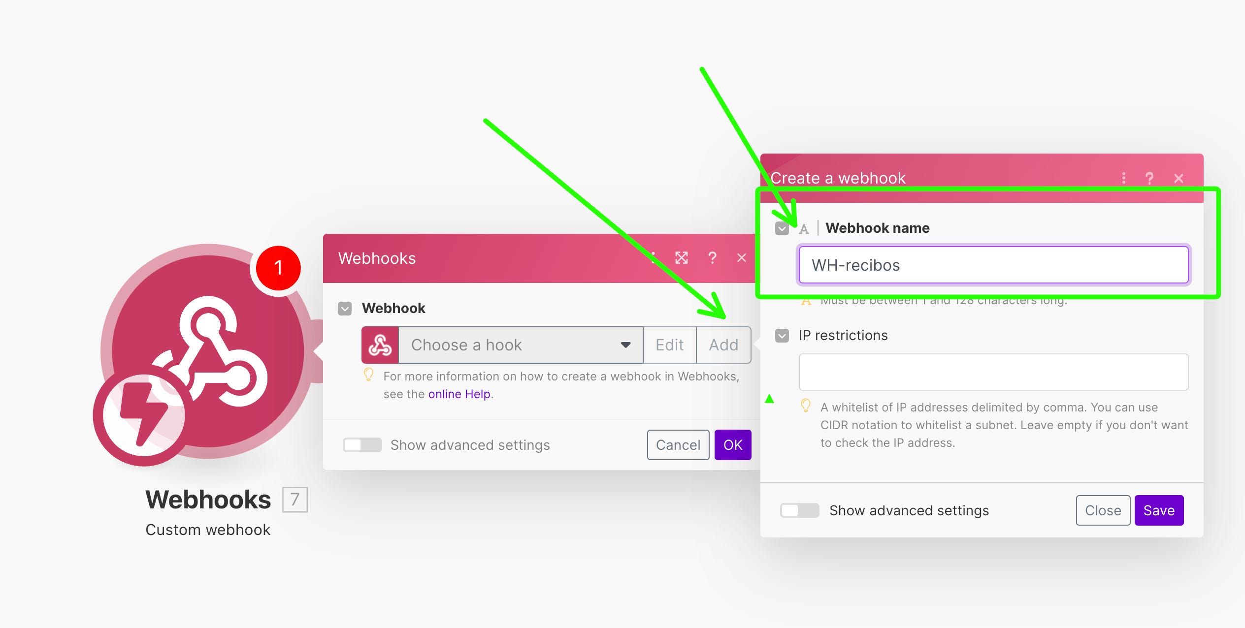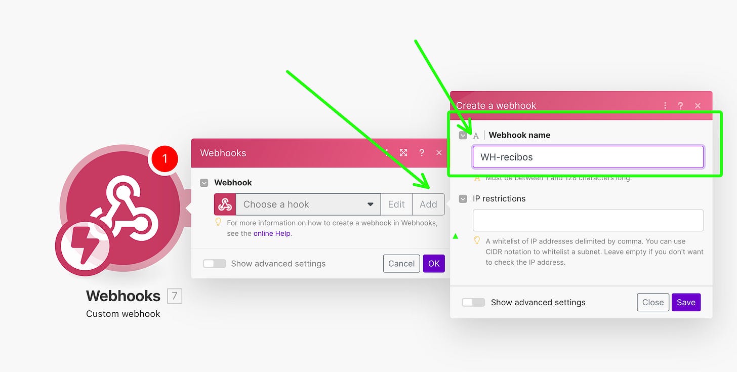 Clique em “Add” para adicionar um Webhook, e mude o “Webhook name” para WH-recibos. Você pode dar o nome que quiser. Eu costumo padronizar os nomes para facilitar o suporte depois.