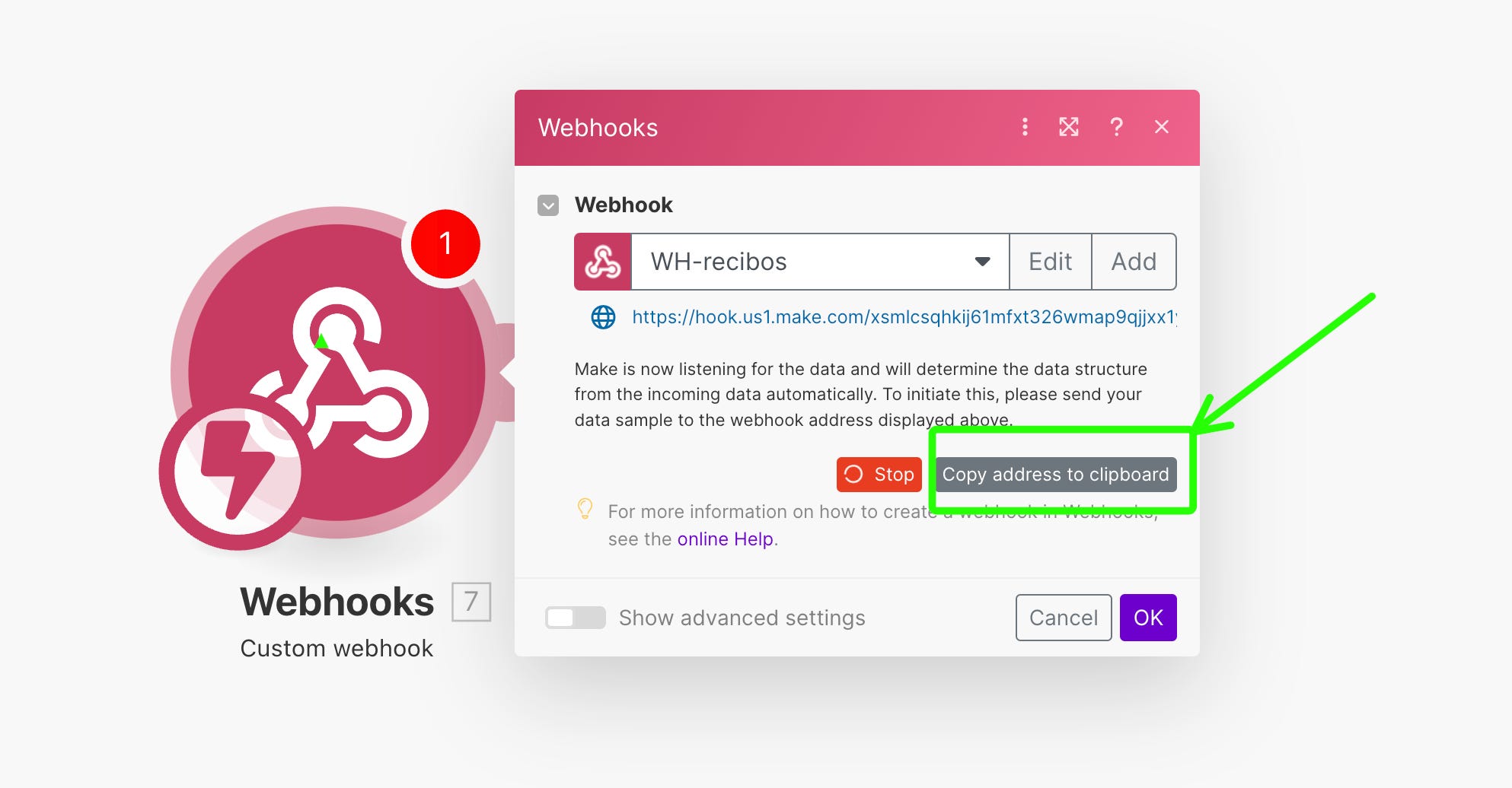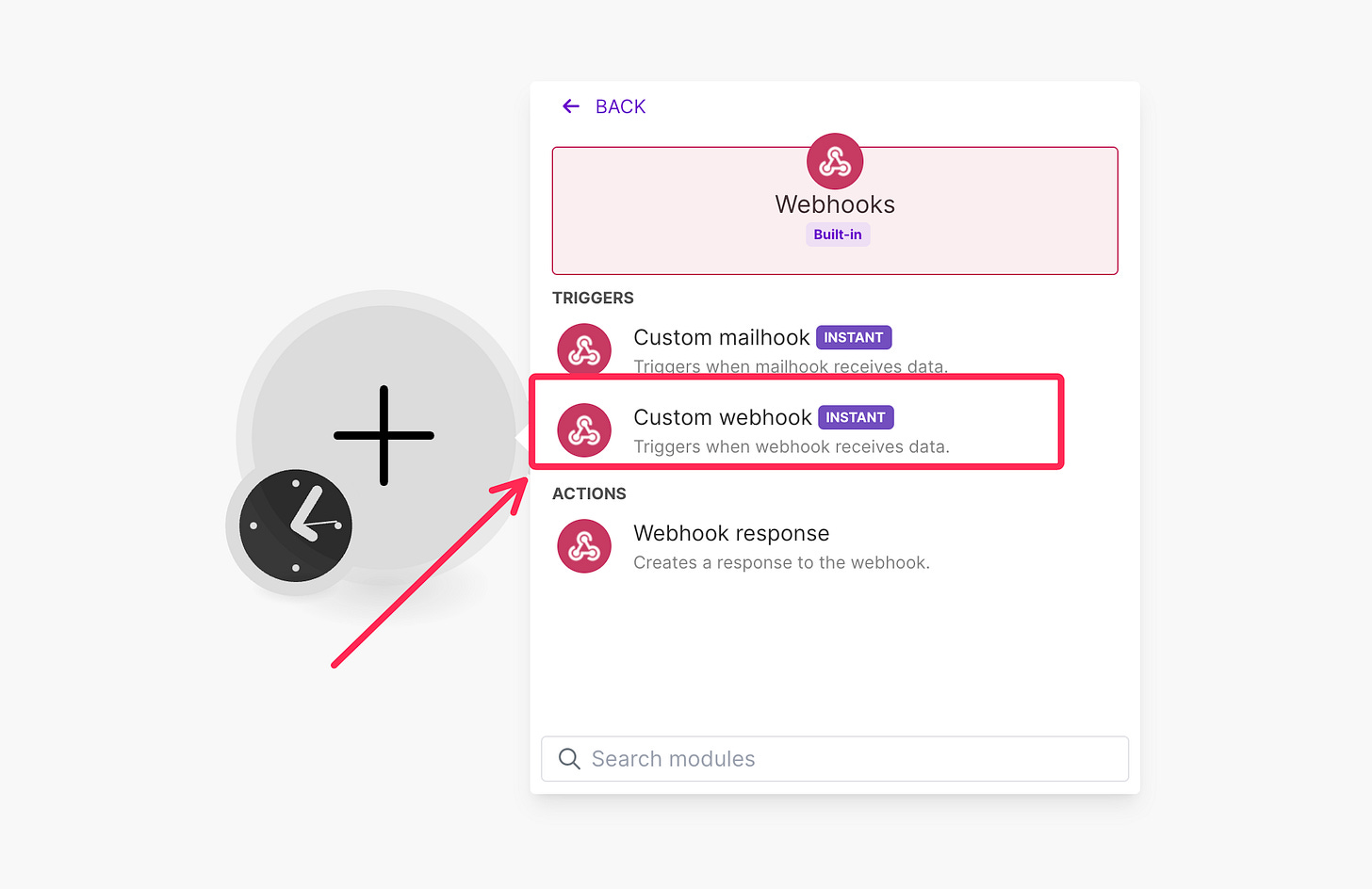Entre no Make.com, crie um cenário e inclua um módulo de Webhook: