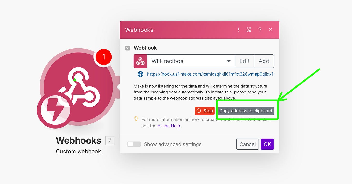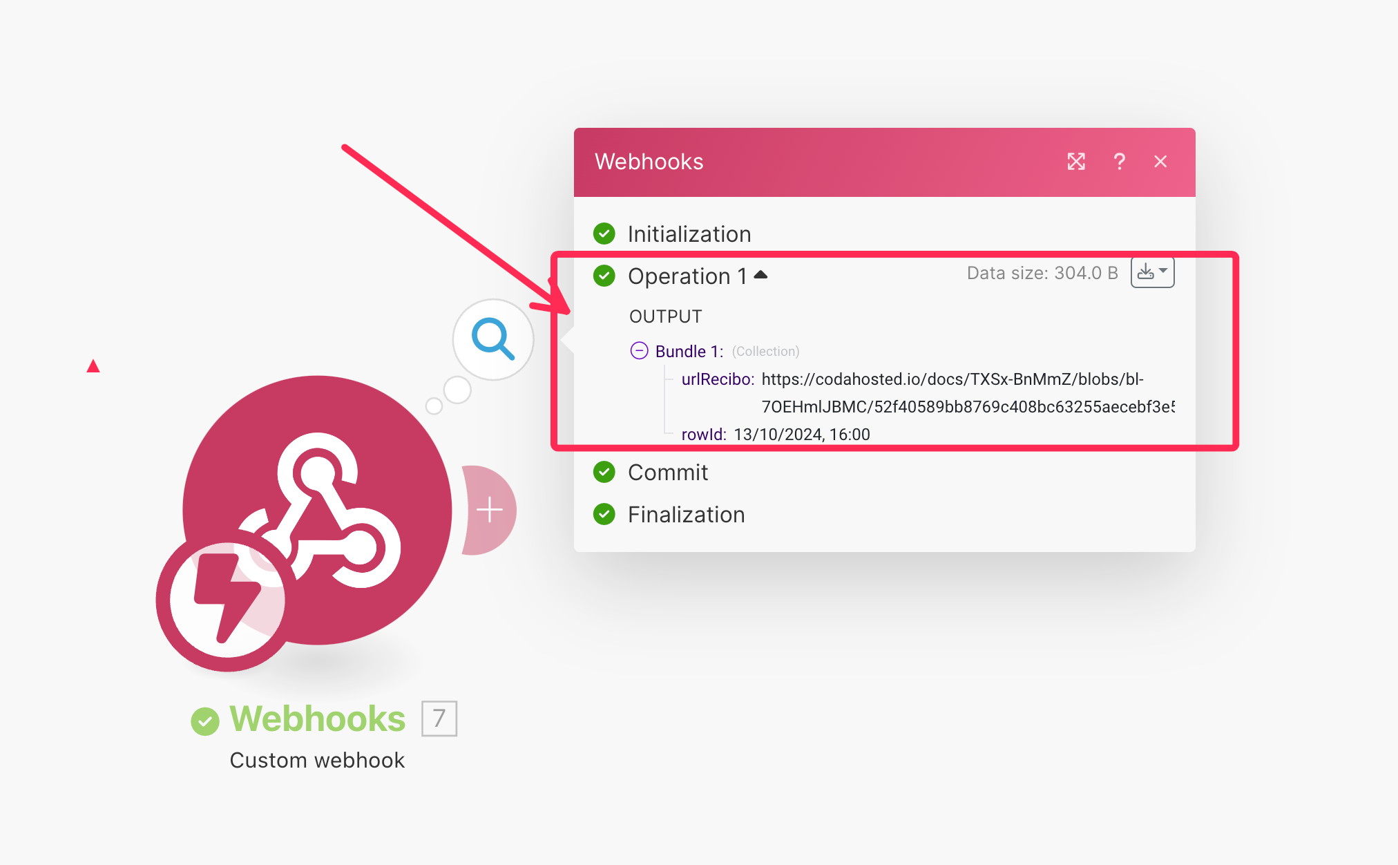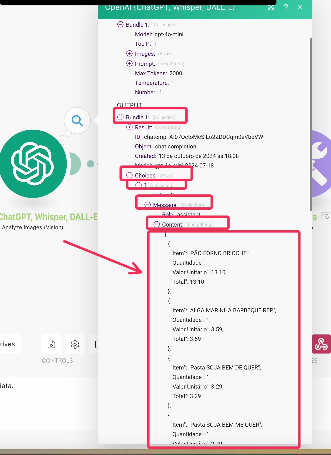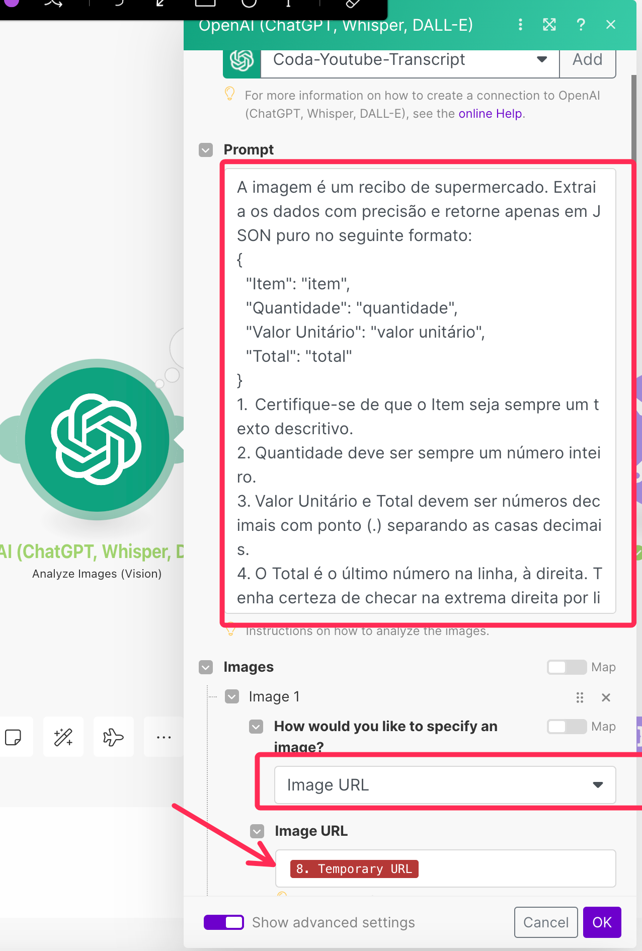 Object("urlRecibo", thisRow.[Foto Recibo].First()._Merge().ToText().ParseJSON("$.publicUrl"))Automação no Make