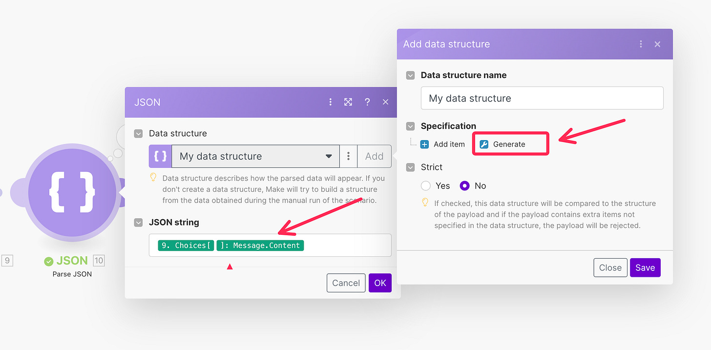 Depois, adicione o módulo “Parse JSON”, clique em “Add” em Data Structure, clique em Generate, e cole o JSON que você copiou no passo anterior. Isso vai fazer com que ele gere uma estrutura de JSON com Item, Quantidade, Valor Unitário e Total - exatamente o que a gente precisa. Você pode fazer isso manualmente também, mas como te passei fica mais simples. Adicione o “Content” do módulo anterior do GPT no “JSON string”. Veja a imagem: