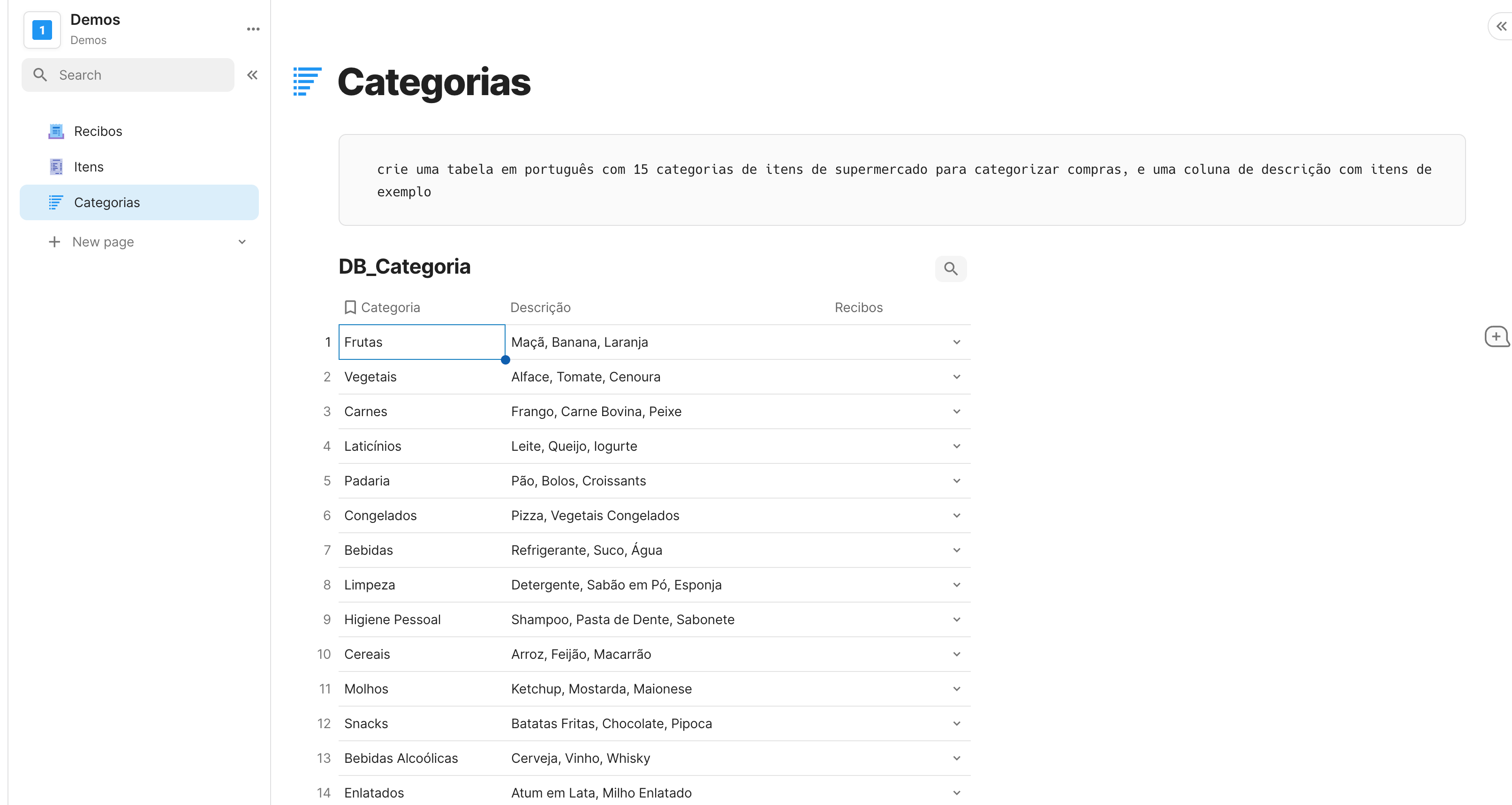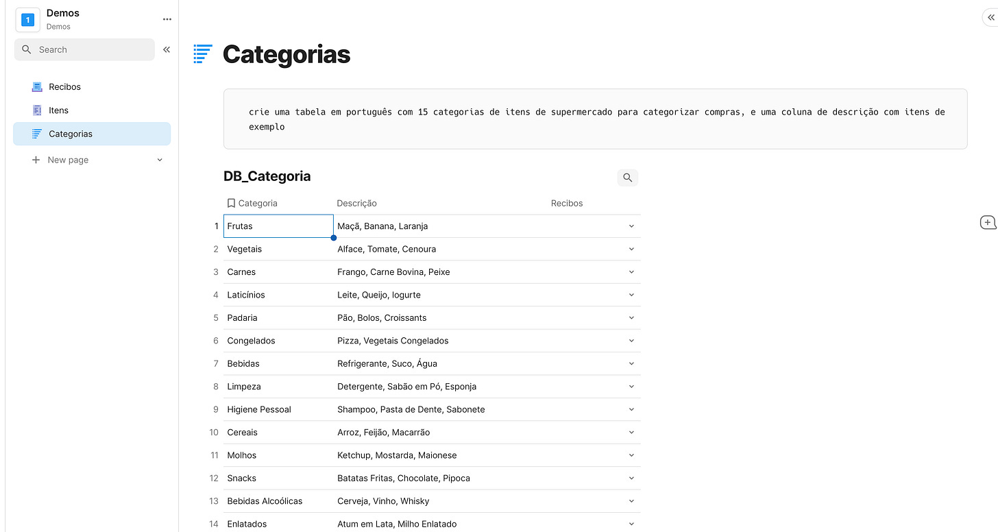 Na página “Categorias”, crie uma tabela usando inteligência artificial, usando o seguinte prompt: